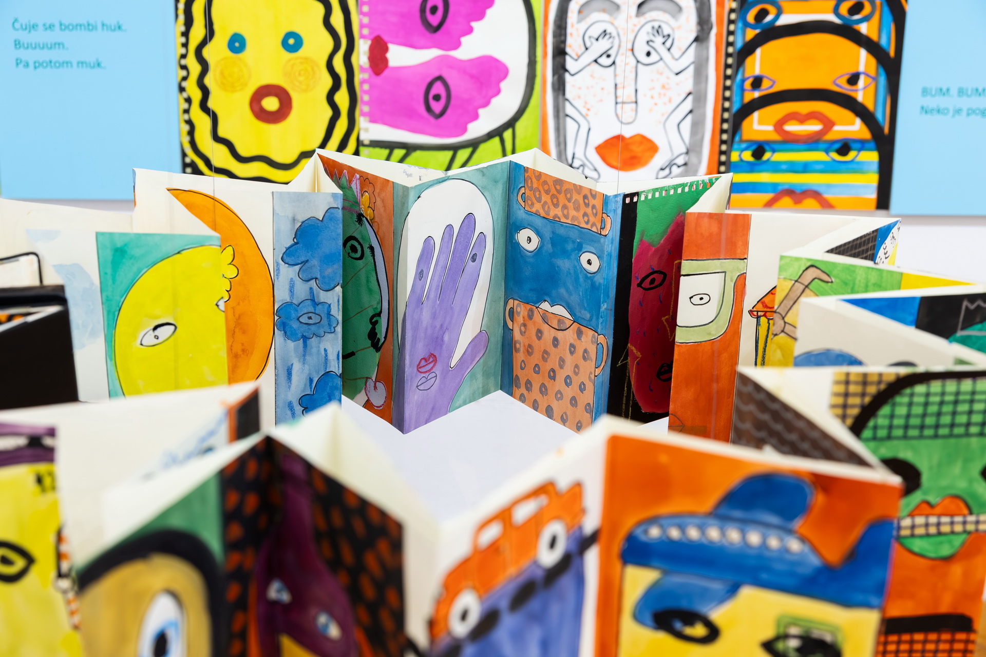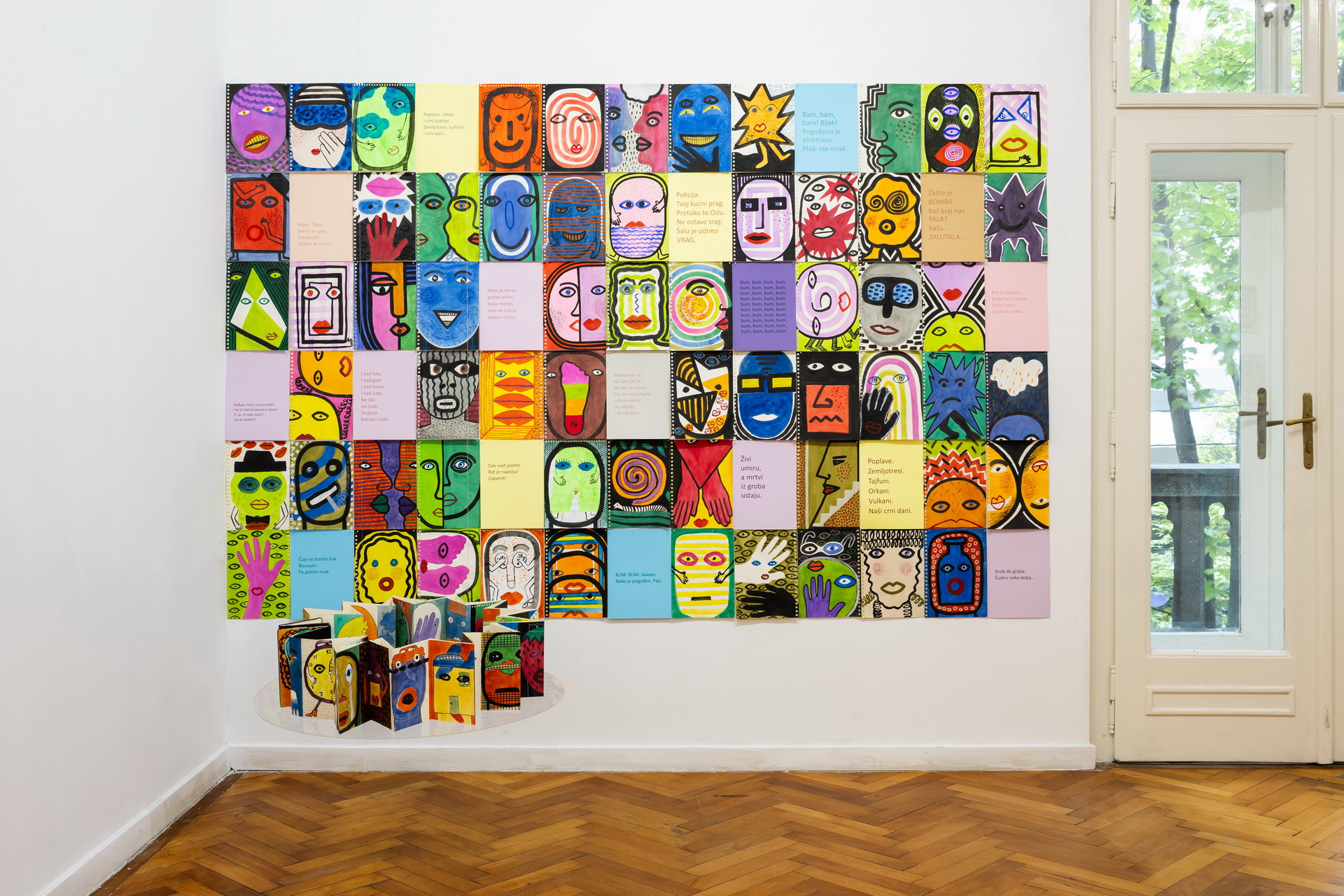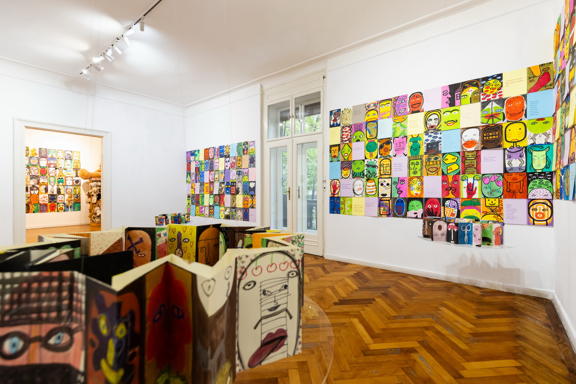 Through this artistic gesture, Willimon questions the very purpose of art and the limits of creative freedom. An impressive wall installation — a hundred drawings and paintings radiating joy and playful brightness — “watches” the viewers from a cage labeled “Dunja and Zoja’s Zoo,” filled with worn and exhausted plush toys. These tender yet slightly unsettling figures raise a question of identification: